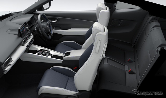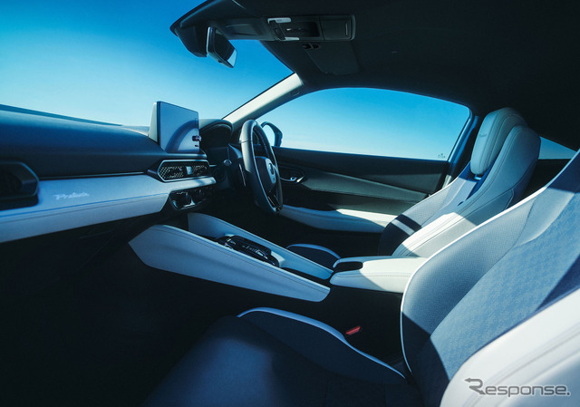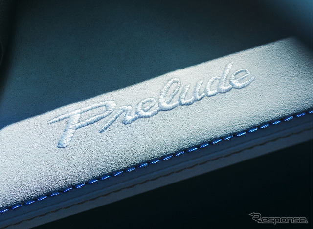 「ブルー×ホワイト」でまとめられたインテリアは、運転席だけでなく助手席も快適な空間をめざした。低く水平基調の視界、「Dシェイプ」デザインのステアリングホイール、メタル製パドル、プレリュード専用のフルグラフィックメーターや、ロゴ刺繍など、所有感や走りへの期待を高めるデザインとなっている。