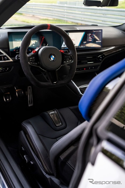 外装では、ボンネットとトランクリッド周囲に手描きのBMWモータースポーツストライプを配置。標準のMカーボンルーフパネルにも3色ストライプが施される。ボンネットのパワードームはブラック仕上げで、オリジナル同様に反転した「turbo」スクリプトが配される。
