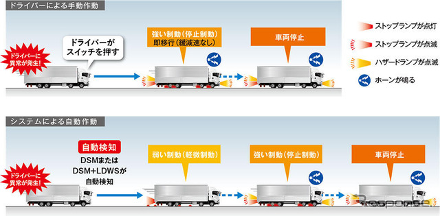 今回の改良では、ドライバー異常時対応システム(EDSS)をオプション設定した。ドライバーの状態をモニタリングするドライバーステータスモニター(DSM)のカメラが異常を検知した場合、もしくはドライバー自身によるEDSSスイッチの操作があった場合にブレーキ制御を自動で開始し、徐々に速度を落として停止する。