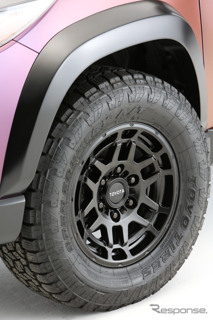 四輪駆動システムには、特注のトヨタ製ホイールとトーヨータイヤ「OPEN COUNTRY A/T III」(オールテレーンタイヤ)を装着し、専用サスペンションリフトによってクリアランスと存在感を高めている。