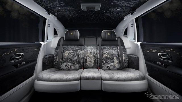 リアシートには、ファッション・アトリエと共同開発した16万針のステッチ仕上げの高解像度プリント生地を採用。フロントシートには、ファントムの伝統にインスピレーションを得た手描きのラインをレーザーエッチングで表現している。
