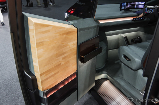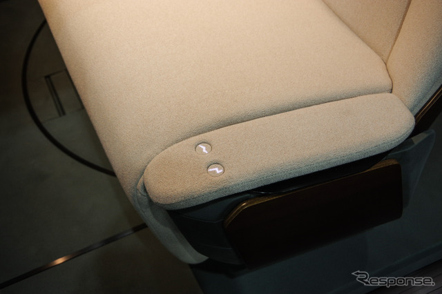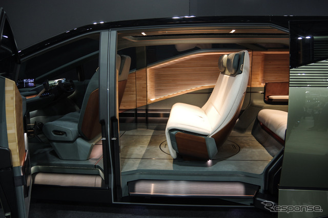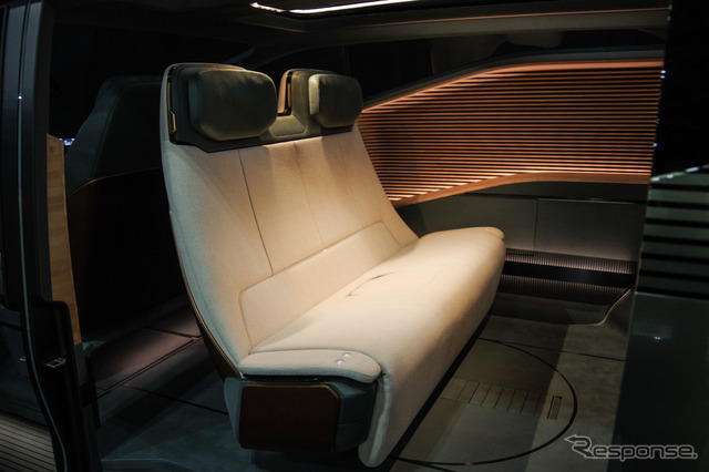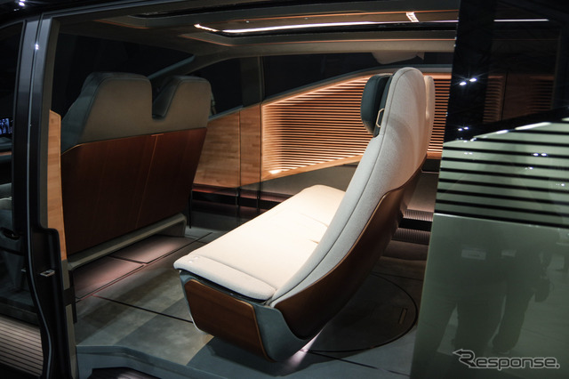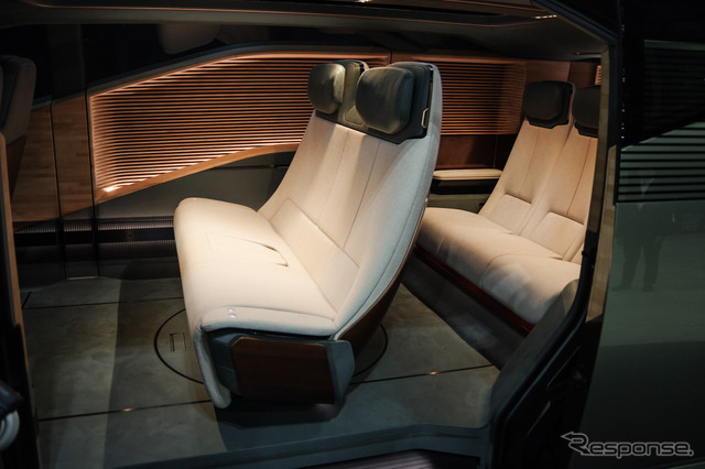 室内空間は広く、3列目でも2列目と同等のスペースを確保。2列目シートは回転することで、向かい合わせに座ることも可能に。次世代のショーファーカーならではの商談スペースに変身する。ウインドウのルーバーやドアパネルに本杢をあしらうことで、安らぎを感じさせつつ高級感のあるインテリアとなっているのも特徴だ。