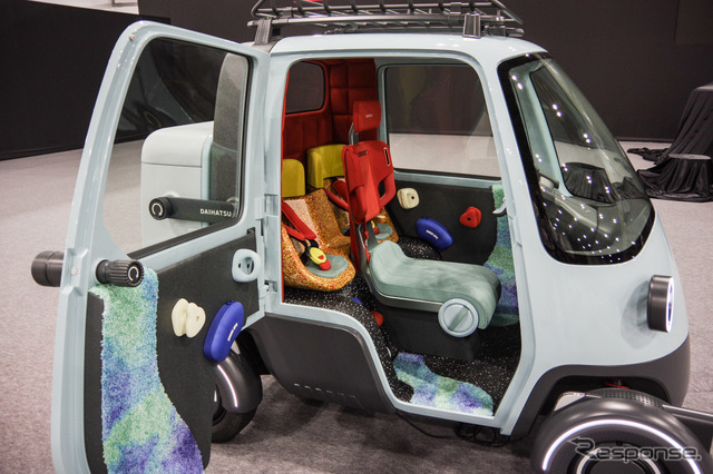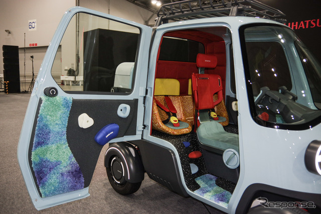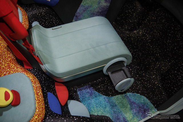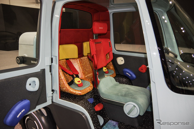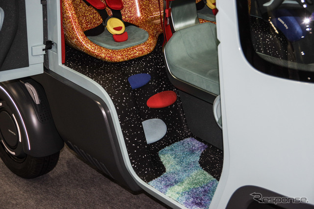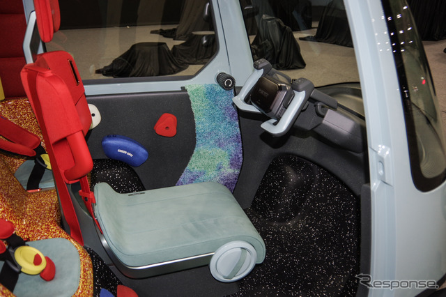ドアノブをひねって前開きドアを開けると、ちょっとしたテーマパークのようなカラフルなインテリアが広がる。後席は子ども用シートとしており、子どもが自分から喜んでクルマに“駆け上がりたくなる”よう、ステップにはボルダリングのイメージを盛り込んだ。