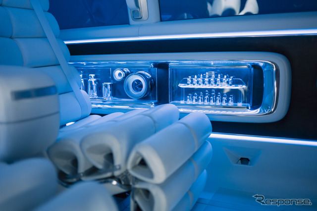 リアラウンジの目玉は、床下から出現する65インチのシネマスクリーンである。4K解像度の映像を42個のスピーカーによるサラウンドサウンドシステムにより、かつてない没入感のある体験を提供する。さらに、天井と床に設置された7つのプロジェクターが視野を拡大し、サイドウィンドウも追加のスクリーンとして機能する。