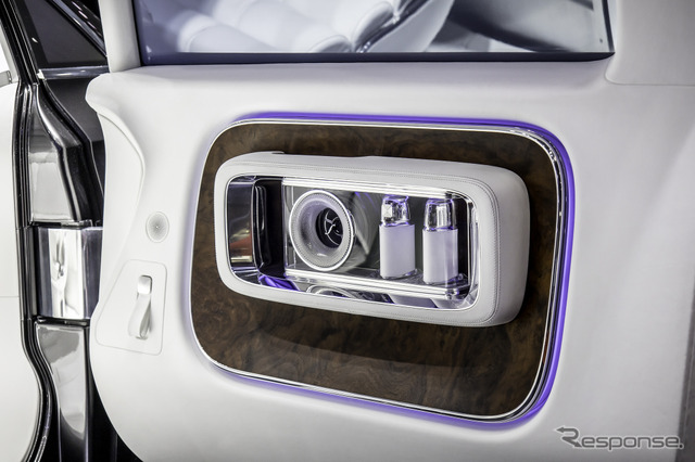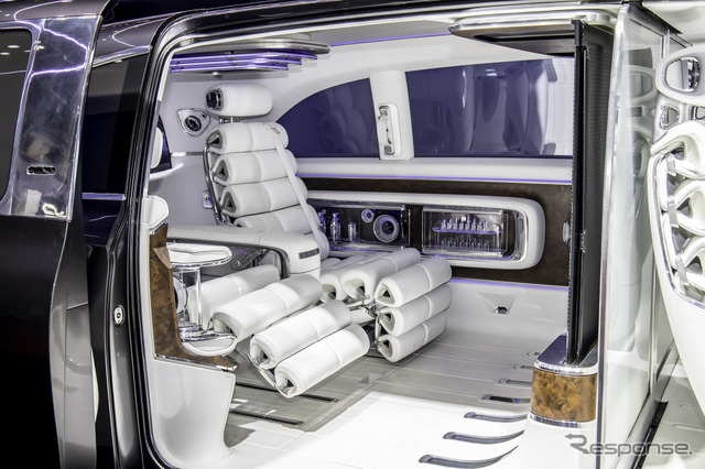 内装には、クリスタルホワイトのナッパレザーや白絹、オープンポアのバールウッドなど、伝統的な素材と最新のテクノロジーを融合させたデザインが採用されている。サイドウォールには、ハンドバッグやサングラス、スマートフォンなどの収納スペースも設けられている。