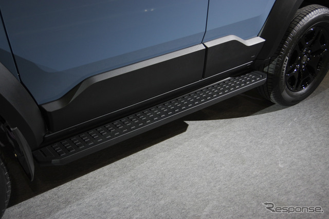 キャビンは、四角い箱のようだ。「それを機動性のあるプラットフォームとどう共存して魅力的に見せるか。下回りを(ブラックにして)強く見せてその上にキャビンが箱のようにポコッと乗っているようにすると、すごく安定感があるようにも見えますし、実際、安定感もあります」とのこと。