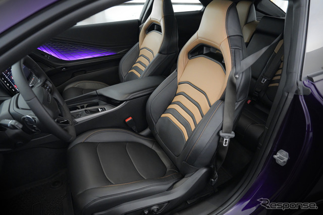 インテリアには、カッツキン プレミアムレザーシートを採用。コントラストの効いたタスカニーインク(ブラック)とパロミノ(タン)の表面に、オレンジとパープルのステッチが施されている。