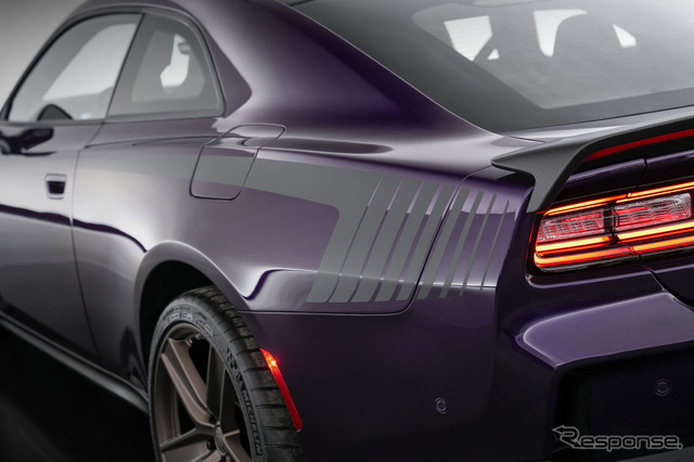 コンセプト専用のベンテッドフェンダーは、ホイールハウス内の空気圧を逃がすことでエアロ性能をさらに向上させる。サテンブラックのMopar「ストローブ」スタイルのボディサイドグラフィックが、ドアからリアクォーターパネルまで全長にわたって配されている。