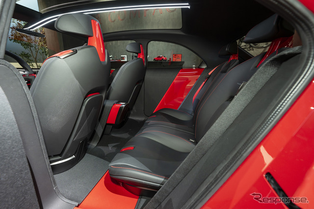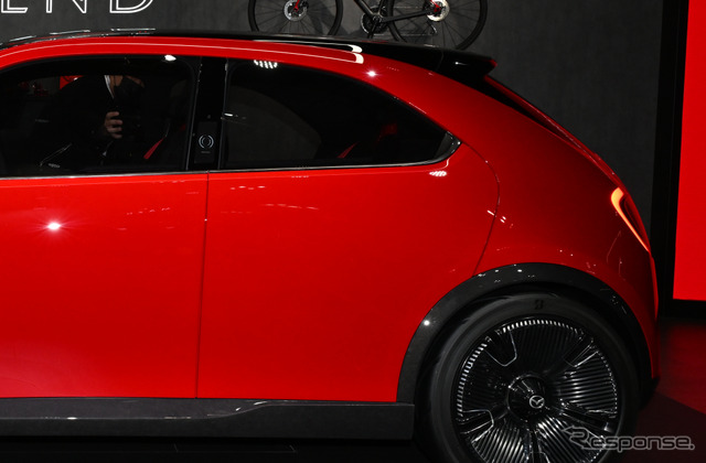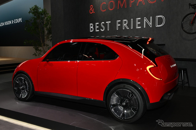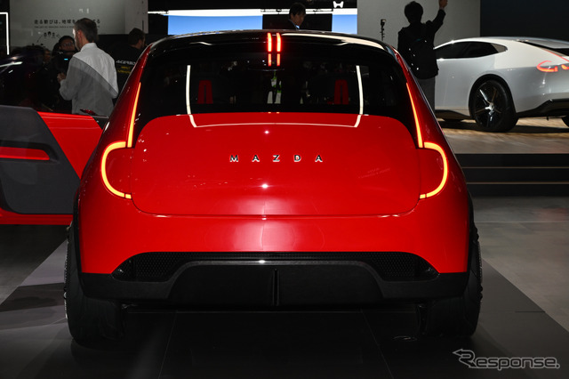 ボディサイズは全長3825mm×全幅1795mm×1470mm、ホイールベースが2515mm。現行のマツダ車で最もコンパクトな『マツダ2』の全長4080mm×全幅1695mm×全高1500~1550mm、ホイールベース2570mmと比べても、ひと回り小さい。『マツダ3』のようにエッジを持たない滑らかで抑揚のあるボディに、SUVのようなブラックのフェンダーを持つのが特徴で、「クロス」の名の通り次世代のコンパクトクロスオーバーを示唆するモデルでは、との予想も。