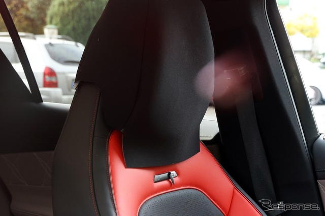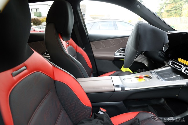 初めて撮影に成功した内部には、ツートンカラーのパンチングレザーがあしらわれた、体にフィットするシートが搭載されている。ディスプレイは、メルセデスベンツ兄弟車に搭載されている39.1インチMBUXハイパースクリーンか。センターコンソールはGLC 400 4MATICからそのまま流用されたように見える。