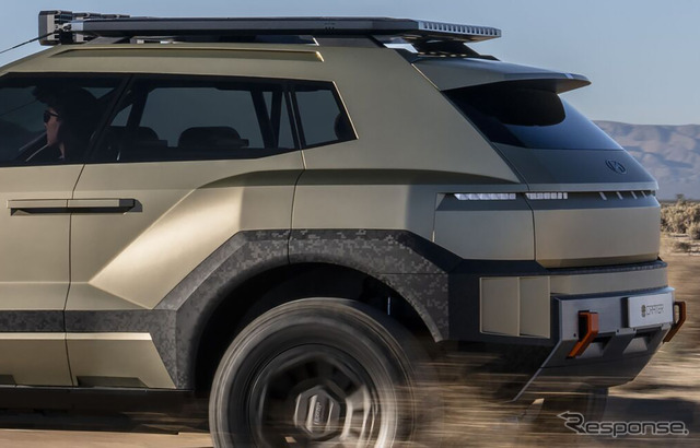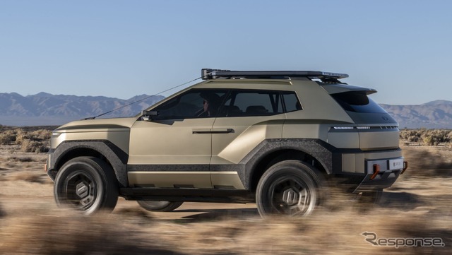 外装は「アート・オブ・スチール」をテーマに、鋼鉄の強靭さを彫刻的な美しさへ昇華。大胆なシルエットのモノコックボディに、小惑星の衝突をイメージした18インチホイールと33インチタイヤ、堅牢なスキッドプレートやルーフプラットフォームを装備し、高い走破性を主張する。カラーはカリフォルニアの海岸地形に由来する「デューンゴールドマット」を採用した。