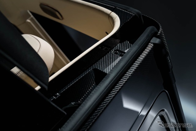 2ピース構造のソフトトップは、ボタンを押すだけでわずか20秒で開閉でき、ヒーター付きの安全ガラス製リアウィンドウを備える。世界初の試みとして、フロントルーフ部分に統合されたカーボンファイバー製サーフェスボウが、高速走行時でも安定したルーフ輪郭と風切り音の低減を実現している。
