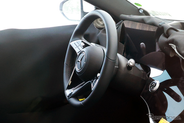 初めて捉えたキャビン内にも注目だ。現行モデルは、独立したデジタルメータークラスターと、ダッシュボードから突き出した縦長のインフォテインメントスクリーンを備えている。いっぽう改良新型は、電気自動車『EQS』と同様のハイパースクリーンを搭載し、メータークラスター、インフォテインメント、助手席側ディスプレイがすべて一枚のパネルに収められている。
