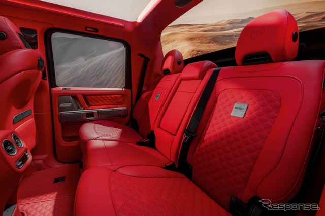 ブラバス XL 800 カブリオの内装では、特注のマスターピース・インテリアが「ペールブラウン」のエクステリア塗装と印象的なコントラストを生み出し、同じ鮮やかな赤で仕上げられたポータルアクスルサスペンションと完璧に調和している。この専用スーパーカーのキャビンは、最高級の赤革で張られ、ブラバスの内装工房で最高の精度で色合わせと手作業による仕上げが施されている。