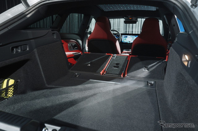 ルーフは後方に伸びてエレガントにフラットなラインを描く。固定式ガラスルーフは標準装備で、フロントウインドシールドからリアまでシームレスに延びている。巧妙なディテールとして、ルーフスポイラーはガラスルーフからの移行部分ではブラックに、外側の領域ではボディカラーに塗装されている。これにより、ガラスルーフがリアウインドウまで続いているような印象を生み出し、リアエンドに独特でエレガントな雰囲気を与えている。