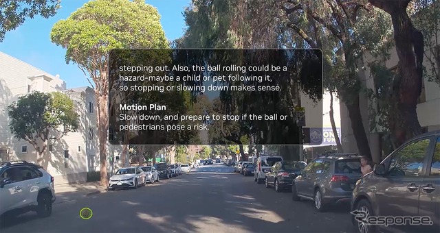 例えば、自転車レーンの隣にある歩行者の多いエリアを走行する自動運転車は、AR1の思考連鎖推論を活用することで、経路からデータを取り込み、特定の行動を取った理由の説明である推論トレースを組み込み、その情報を使用して自転車レーンから離れたり、飛び出しの可能性がある歩行者のために停止したりするなど、将来の軌道を計画できる。