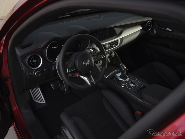 ブレーキシステムには、カーボンセラミック製を採用。バーニッシュ加工されたアノダイズドキャリパーには赤いアルファロメオのロゴが入り、高い制動性能とともにスタイリッシュな外観を実現している。