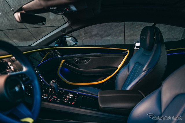 ファシアとウエストレールのデュアルフィニッシュピアノリネンベニアは、外装のダークサファイアにマッチした塗装ピンストライプで二分されている。ゴッホが星月夜の星にインディアンイエローを使用したことは、ベントレーのカムンアクセントレザー、刺繍されたベントレーエンブレム、コントラストステッチに対応している。