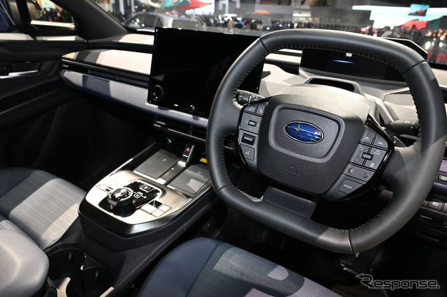 室内は明るいキャビンデザインで、スバル車史上最大となる14インチタッチスクリーンを装備。ダッシュボードのメタリック仕上げが、インテリア全体の落ち着いた水平基調のテーマを強調している。大型センターコンソールは、デバイス充電と個人用品収納の中心的なハブとなる。全モデルでグレーまたはブラックのスターテックス素材のシート表皮を標準装備し、ツーリングモデルではブラックとブルーのレザーシート表皮も選択可能だ。