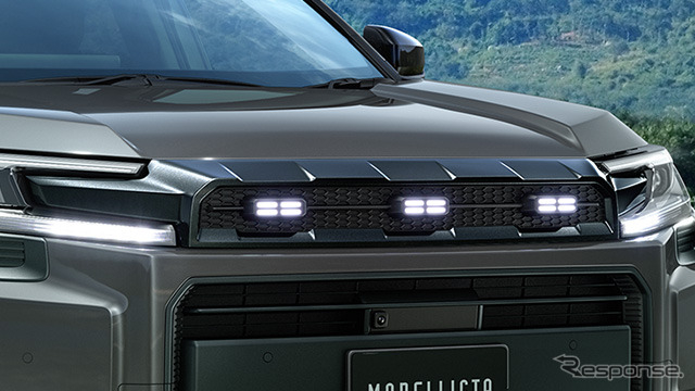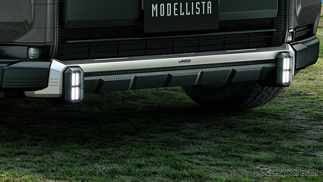フロントグリルイルミネーションはグロスブラックのグリルが、ワイルドなSUVスタイルを強調。3つのLEDマーカーをワイド方向に配し、先進的でアイコニックな表情と、力強い存在感を演出する。フェンダーガーニッシュはグロス&マットブラックの組み合わせにより、タフな力強さとスタイリッシュさを高めるアクセントアイテム。MODELLISTAエンブレムを配置することで、特別感を演出する。