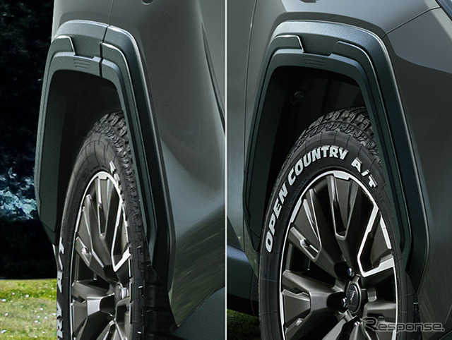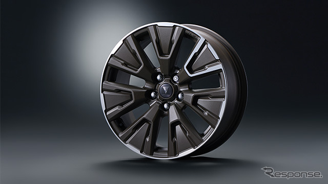 オーバーフェンダーは立体感のあるラギッドなデザインがフェンダーと四輪の力強さを際立たせ、タフで機能的なイメージを強調する。18インチアルミホイールセットはダークブロンズの立体的なスポーク造形が力強い存在感を強調。リムに沿った切削面のグラフィックラインは一箇所のみ内側に回り込む非対称デザインとすることで、個性的でスタイリッシュなイメージとした。