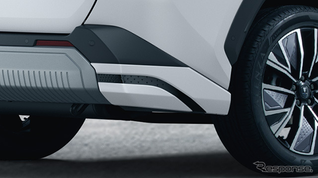 ボディパーツセットは、フロントバンパーガーニッシュ(LED付)とリヤバンパーガーニッシュのセット。フロントバンパーガーニッシュは金属調の張り出した立体の中にラギッドな質感をもつ、メテオコートのアンダーガードを配置することで、ダイナミックでタフなスタイルを表現。縦型のLEDが精緻でファンクショナルなフロントフェイスを演出する。リヤバンパーガーニッシュは金属調のスクエアな立体と押し出し感のあるブラックの造形で、力強いリヤスタイルを強調。フロントと呼応したデザインとメテオコートで統一感をもたせ、個性的かつ洗練された印象を演出する。