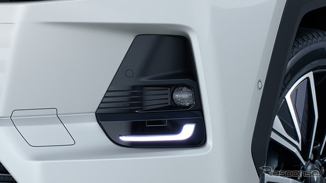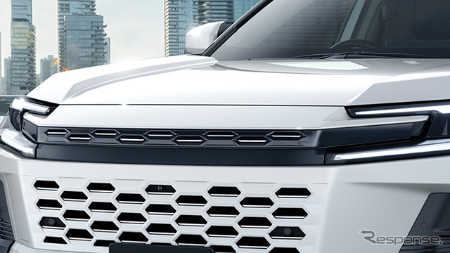 フロントグリルはセンター部にバンパー造形とシンクロさせた六角形のレリーフと金属調加飾を配し、左右を繋ぐブラックのグラフィックとあわせ、よりワイド感のあるフロントフェイスを創り出す。シグネチャーイルミはフォグランプベゼル下側にシャープなL字のLEDイルミを配し、先進的なフロントフェイスを演出する。
