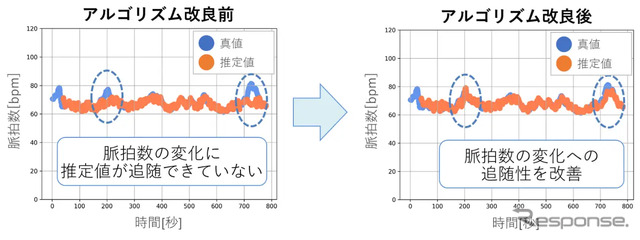 まず、DMSの近赤外カメラ映像から、運転中のドライバーの脈拍数を高精度に計測する。近赤外カメラを用いて取得したドライバーの顔映像から、脈動に伴う血液流量変化による皮膚反射の微小輝度変動を抽出することで、非接触で脈拍数を計測する。アルゴリズムの改良により走行時の外乱を抑制し、脈拍数の変化への追随性を向上させることで、飲酒による交感神経活性化に起因する脈拍上昇を高精度に検出する。車載ECUにソフトウェアのアップデートで搭載可能だ。