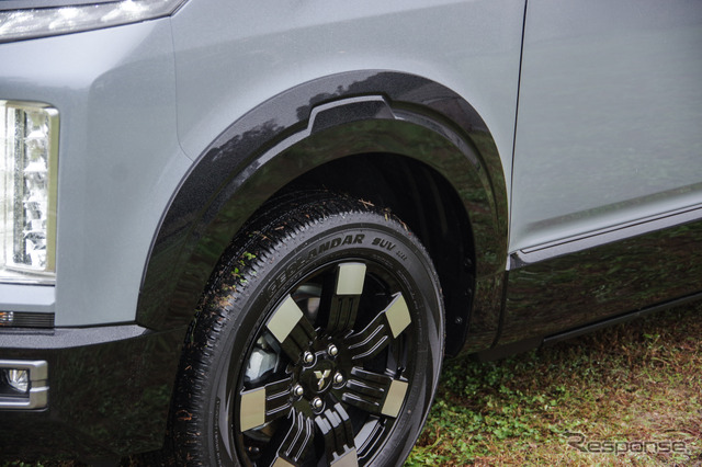エクステリアではフェンダーガーニッシュを新たに装備。全幅で20mm拡大した。これもタフさやギア感を演出するためだ。「デリカD:5は、少し背が高い割に車幅はそれほど広くないので、どっしり感が弱かった。そこでフェンダーガーニッシュを付けました。本当はトレッドも広げてタイヤも太いものを履かせたかったんですが、燃費影響などもありメーカーとしてはやりませんでした」と藤井さん。しかし、デリカユーザーの多くは購入後ホイールやタイヤを変えることから、「(フェンダーガーニッシュがあることで)より格好良く乗ってもらえるでしょう。パッと見ての印象とともにワイド感も違いますから」と話す。