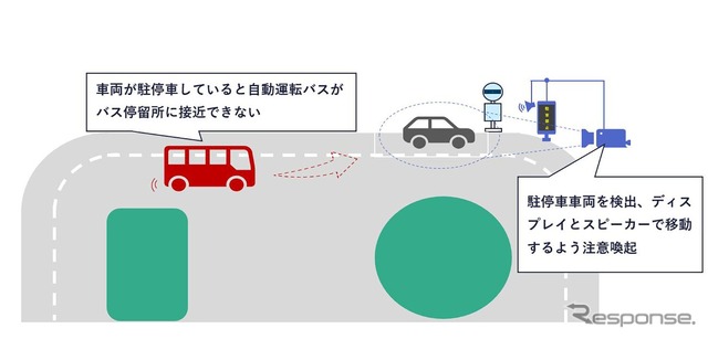 また、バス停留所とその付近に一般車が駐停車した場合は、路車協調システムがその車両を検出し、表示や音声で移動するよう促すことで、自動運転バスのスムーズな運行を支援する。