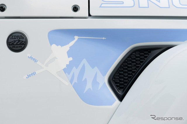 ボンネットにはスキーとスノーボードをモチーフにした大きなデカールを採用。サイドフェンダーにはスキーヤーとスノーボーダーが疾走するシルエットを描いた。これらのデカールは米国のプロダクトデザインチームと共同で制作した。左リアガラスには、ジープの原点ともいえるウィリスMBと雪男が並んで歩くシルエットを施すなど、遊び心あふれるディテールも加えている。