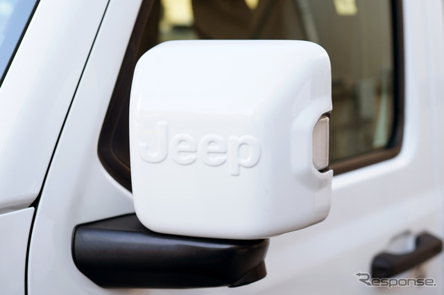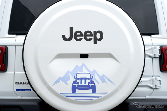 車両の背面には、ラングラーのイラストをプリントしたホワイトのハードタイプスペアタイヤカバーを装備。ジープロゴ入りのホワイトドアミラーキャップとあわせて、白銀の世界をイメージした一体感のある仕上がりとなっている。