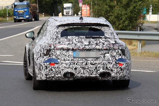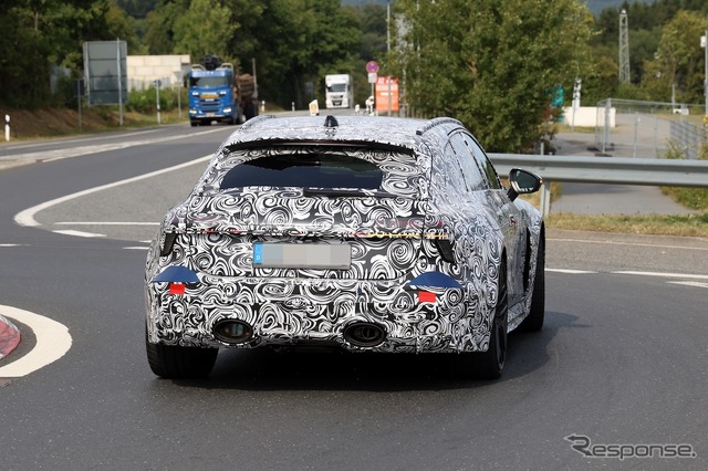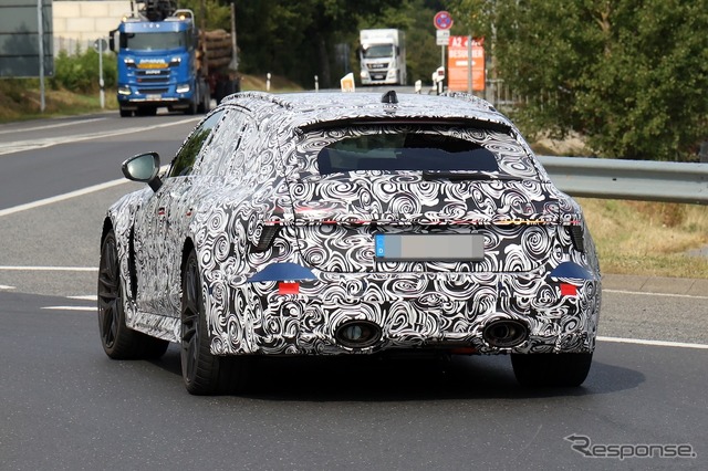 プロトタイプはまだカモフラージュで覆われているものの、最終デザインは見えてきている。このワゴンが最新のRS6であることを示しているのは、センター寄りにマウントされた2本の巨大なテールパイプか。しかしこれらのパイプは偽物だ。よく見ると、その内側にひと回りコンパクトな本物のパイプが見えるからだ。