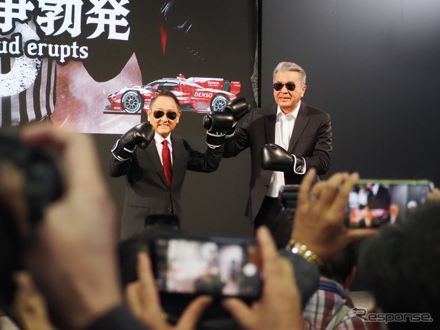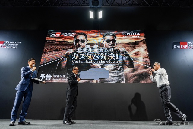 カスタム対決は、記者会見の時点では発表前。中嶋副社長が口を滑らしたが、どうやら『カムリ』のカスタマイズらしい。現在、カムリは日本市場で販売されていないが、2026年からアメリカ製を販売することになっている。豊田会長と中島副社長は、サングラスをかけ、さらにボクシンググローブをはめてポーズを決めた。