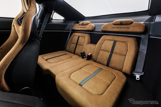 最新プロトタイプはケータハム伝統の鋼管スペースフレーム構造を採用。高剛性と軽量化を両立し、ダイレクトなハンドリングと優れた運動性能を実現している。ボディサイズは全長4350×全幅1850×全高1230mm、ホイールベースが2630mm。バッテリーを搭載するEVでありながら車重1430kgを実現。EVパッケージに対応しながらも一体感のあるドライブフィールを維持しているという。