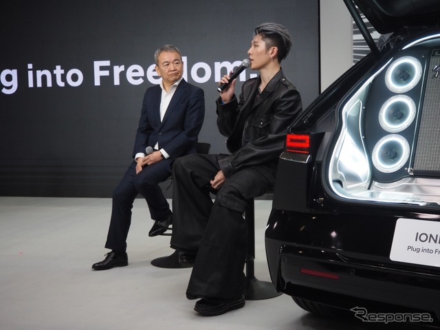 MIYAVI はコンセプトカーの実車を見るのは幕張メッセのプレゼンテーション現場が初めて。「単純にかっこいいですね。キャンプに行ってギターやキーボードを鳴らしてみたい。外部電源供給ができるので、普通だとありえないような場所でライブをやってみたい。渋滞で動かない時に、高速道路でセッションができますね」。