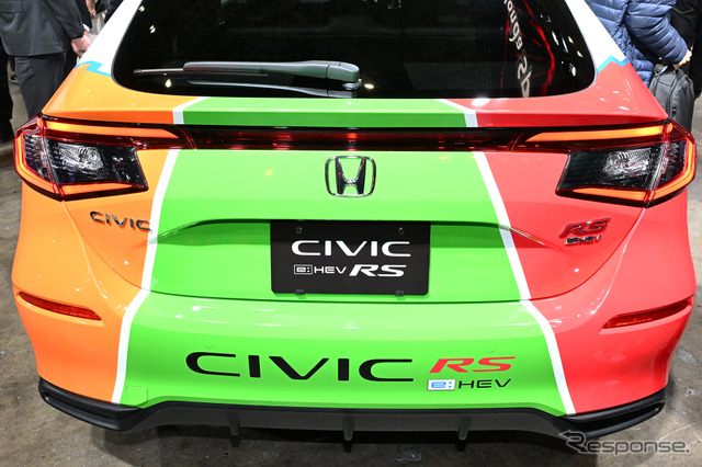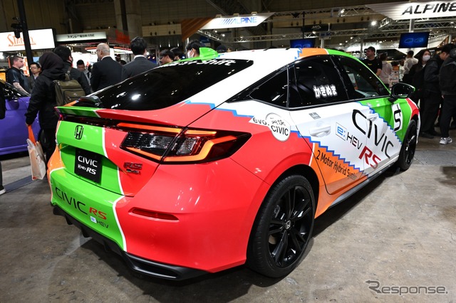 モータースポーツ参戦車両をはじめ多彩なカスタムカーが並ぶ中、それらに負けじとド派手にラッピングされたシビック e:HEV RSが展示された。