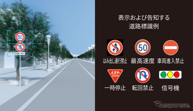 ロードサインアシストは、速度、一時停止、転回禁止、信号機などの道路標識を読み取り、マルチインフォメーションディスプレイへ表示。赤信号見落としの告知機能として、ディスプレイの点滅表示やブザーにより注意を促す。
