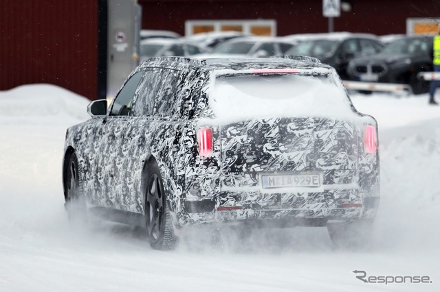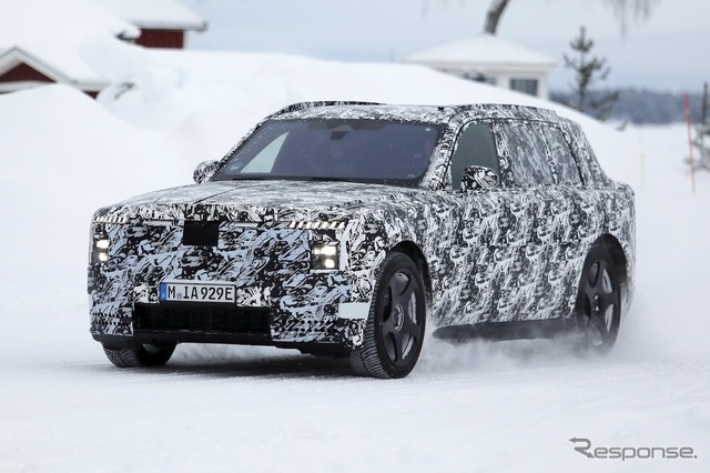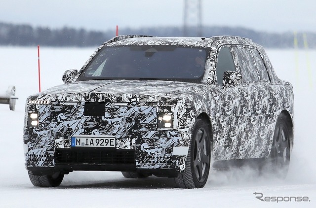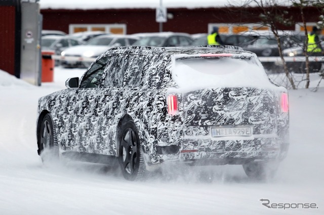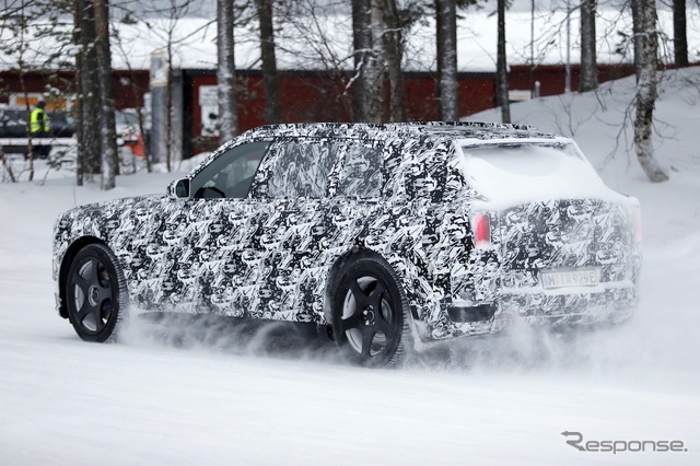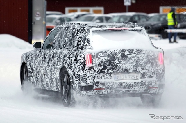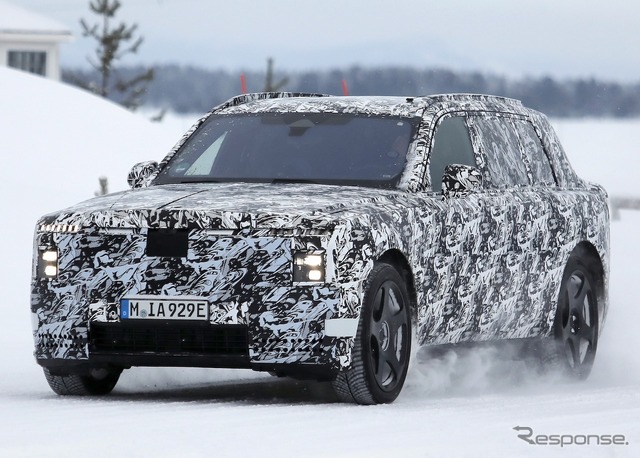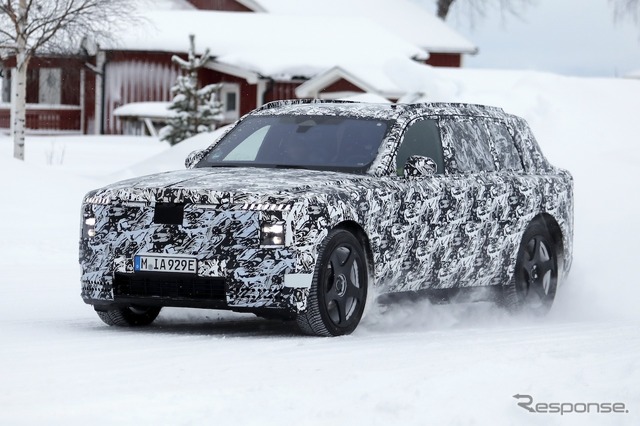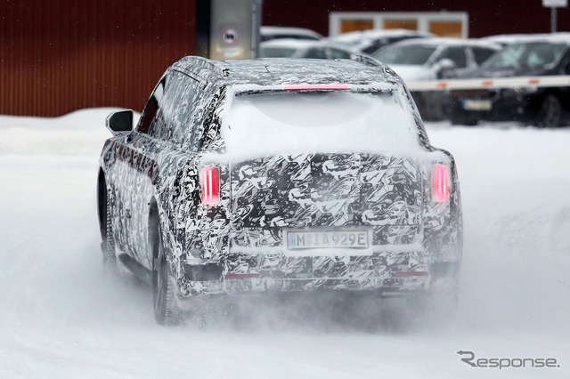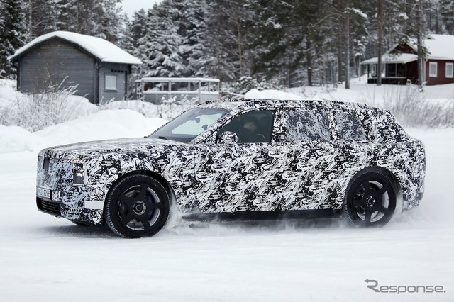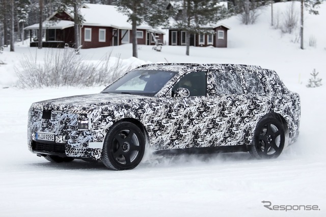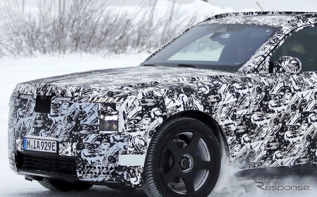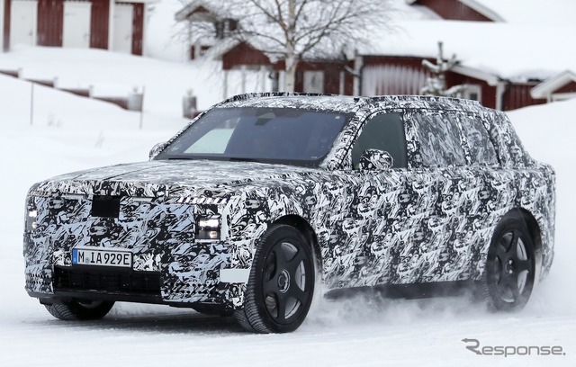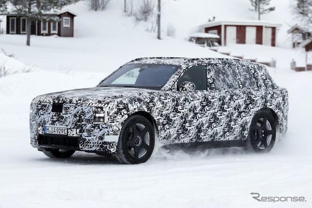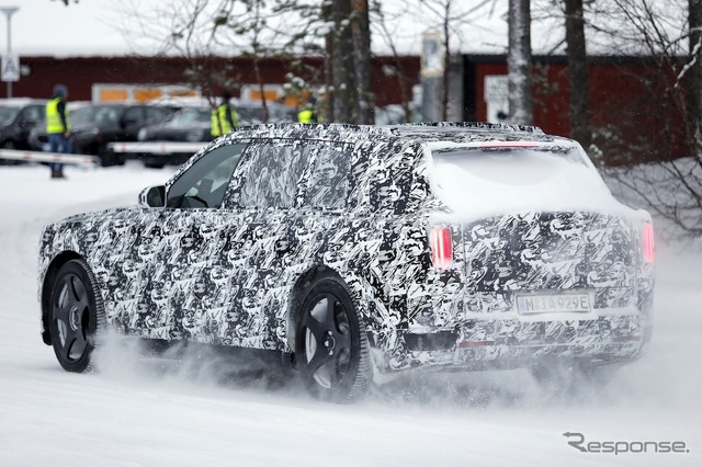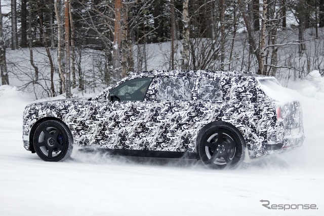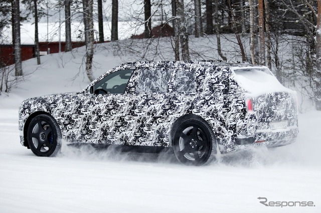 スカンジナビアで寒冷地テストが行われているところを目撃された新型車のプロトタイプは、厳重なカモフラージュが施されているものの、一目でロールスロイスのSUVだと分かる。同時に、分割されたライトユニットと、よりワイドになったと思われるグリルを備えた、新しいフロントフェイシアにも気付く。スペクターを彷彿とさせる、ワイドな下部インテークも確認できる。後方を見ると、膨らんだボンネットと際立ったショルダーラインが目を引く。