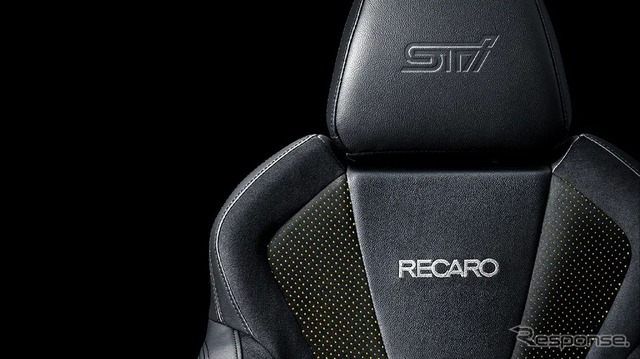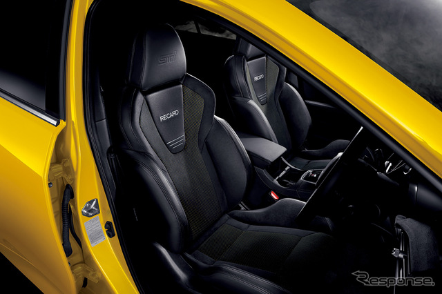 インテリアでは、スエード調のインパネミッドトリムとドアトリムを採用。シート表皮はイエローパーフォレーションとしたSTIロゴ入りRECARO製フロントシートを装備し、特別感と存在感を演出している。