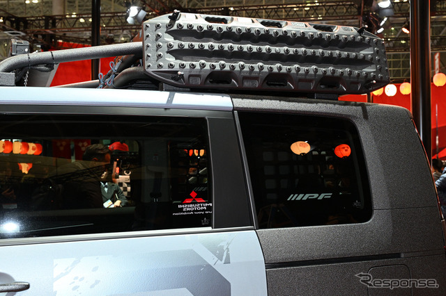 このULTIMATE GEARは、ザラザラとして傷が目立ちづらい「ラプター塗装」を車両全体に施したタフスタイルが特徴だ。「単に見た目だけではなく、実際に飛び石などにも効果がありますので、よりタフに使ってもらえるでしょう」と説明。その塗分けにもデリカの特徴を生かし、「リブボーンフレームの強固なイメージをより視覚的にも感じられるようにしています」という。