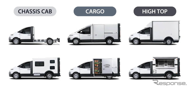 標準カーゴモデルのほかにシャシーキャブモデル、カーゴ冷凍モデル、特装ハイトップモデルをラインナップ。物流、移動販売、サービスカーなど幅広い用途に対応するビジネスプラットフォームとしてだけでなく、可変性を備えたキャンピングカーのベース車両としても活用が可能だ。