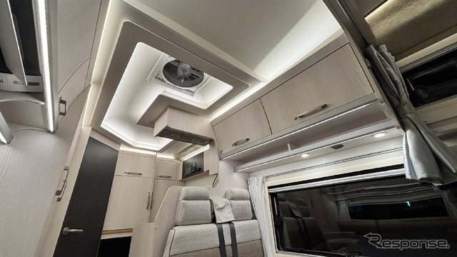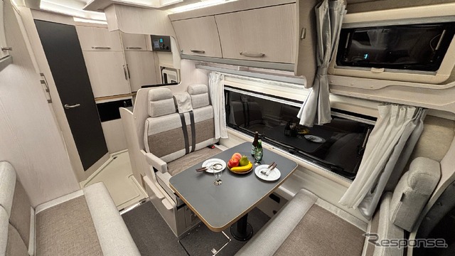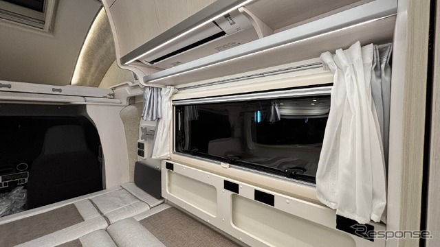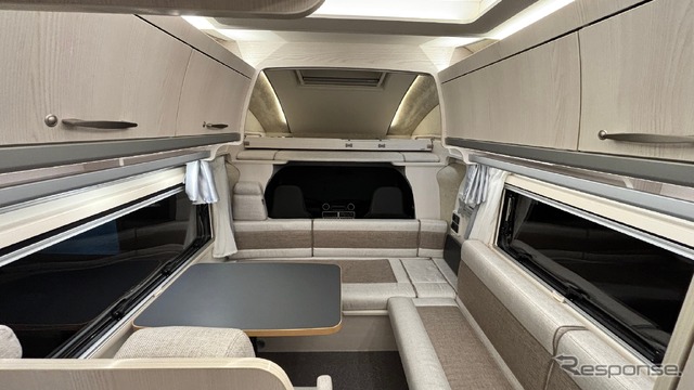 天井間接照明はLEDによる柔らかな間接照明が、車内に落ち着いた雰囲気を演出する。アクリル2重窓は網戸とブラインドを備え、通気と遮光を自在に調整できる。折りたたみテーブル&TVアームはセカンドシート右側に装備。レースカーテン&遮光カーテンは用途やシーンに合わせて使い分けられる。