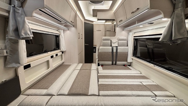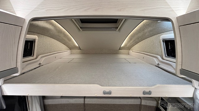 セカンドシートとサイドシートの背もたれを通路に埋め込むことで、長さ1800mm×幅1860mmの広大なベッドスペースが生まれ、大人3名がゆったり就寝できるレイアウトとなる。バンクベッドにも近い一体感があり、家族で一日の旅を振り返りながら温かな空間になっている。