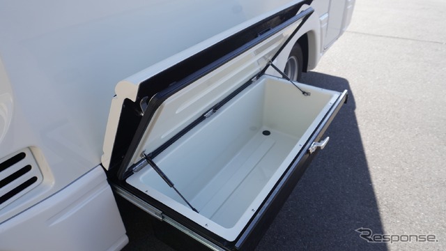 リア左側には引き出し式外部収納庫を配置。防水仕様のため、雨天時でも内部に水が溜まる心配はない。約132Lの大容量を確保し、耐荷重は100kgまで対応する。
