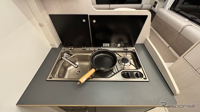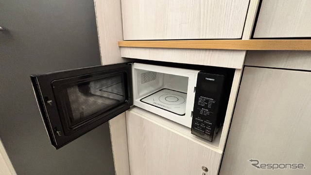 冷蔵庫は横開き式85L(冷凍庫12L付)を装備。電子レンジは標準装備だ。ステンレスシンクと2バーナーコンロを一体化したユニットを採用し、汚れに強く手入れしやすい。使用しない時は、耐熱ガラスカバーを閉めるとフラットになり調理台スペースを広げられる。