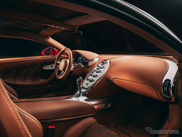 F.K.P.オマージュのインテリアは、シロンや『ミストラル』を含む他の最近のW16モデルと比較して、ほぼ完全な革命を表している。オリジナルのヴェイロンのような円形でバウハウス的な特徴を持つユニークなステアリングホイールに、ソリッドアルミニウムブロックから削り出された完全にビスポークのセンターコンソールとトンネルカバーが加わる。パリで独占的に織られたカスタムカークチュールファブリックは、『トゥールビヨン』で導入されたブガッティの最新のインテリアパーソナライゼーションの進歩を表している。これはヴェイロンのレザーオンリーインテリアからの進化だ。