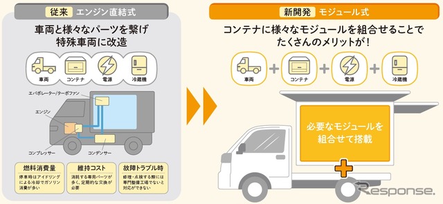維持コスト削減では、従来のエンジン直結式構造では冷蔵機関連の専用パーツが多く、定期的なメンテナンスや交換が必要となっていた。一方、「いちばキャビン」は冷蔵装置にD-mobicoと電源にポータブルバッテリーのみを採用。各機能を独立させた構造とすることで専用パーツの使用を抑え、整備・交換の負担を軽減する。これにより維持コストの低減が期待できる。