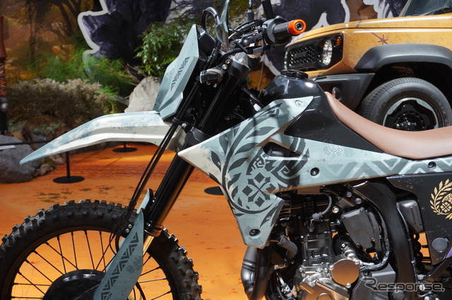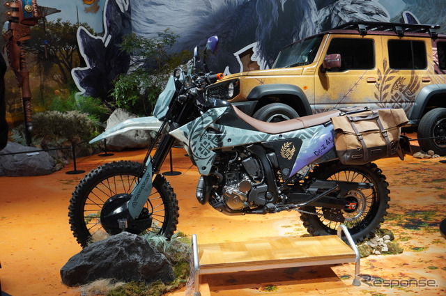 今回展示するのは、1月に開催された「東京オートサロン2026」「大阪オートメッセ2026」にも出展し、好評を得た「JIMNY NOMADE MONSTER HUNTER WILDS Edition」と「DR-Z4S MONSTER HUNTER WILDS Edition」だ。