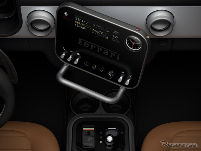 精密に設計された機械式のボタンやメーター、トグル、スイッチ類と、多機能デジタル・ディスプレイを組み合わせたインターフェースの主要コンポーネントを示した。フェラーリは、機能的で直感的な意図疎通と刺激的なドライビング・エクスペリエンスを実現するため、あらゆる要素を徹底的に検討したとしている。